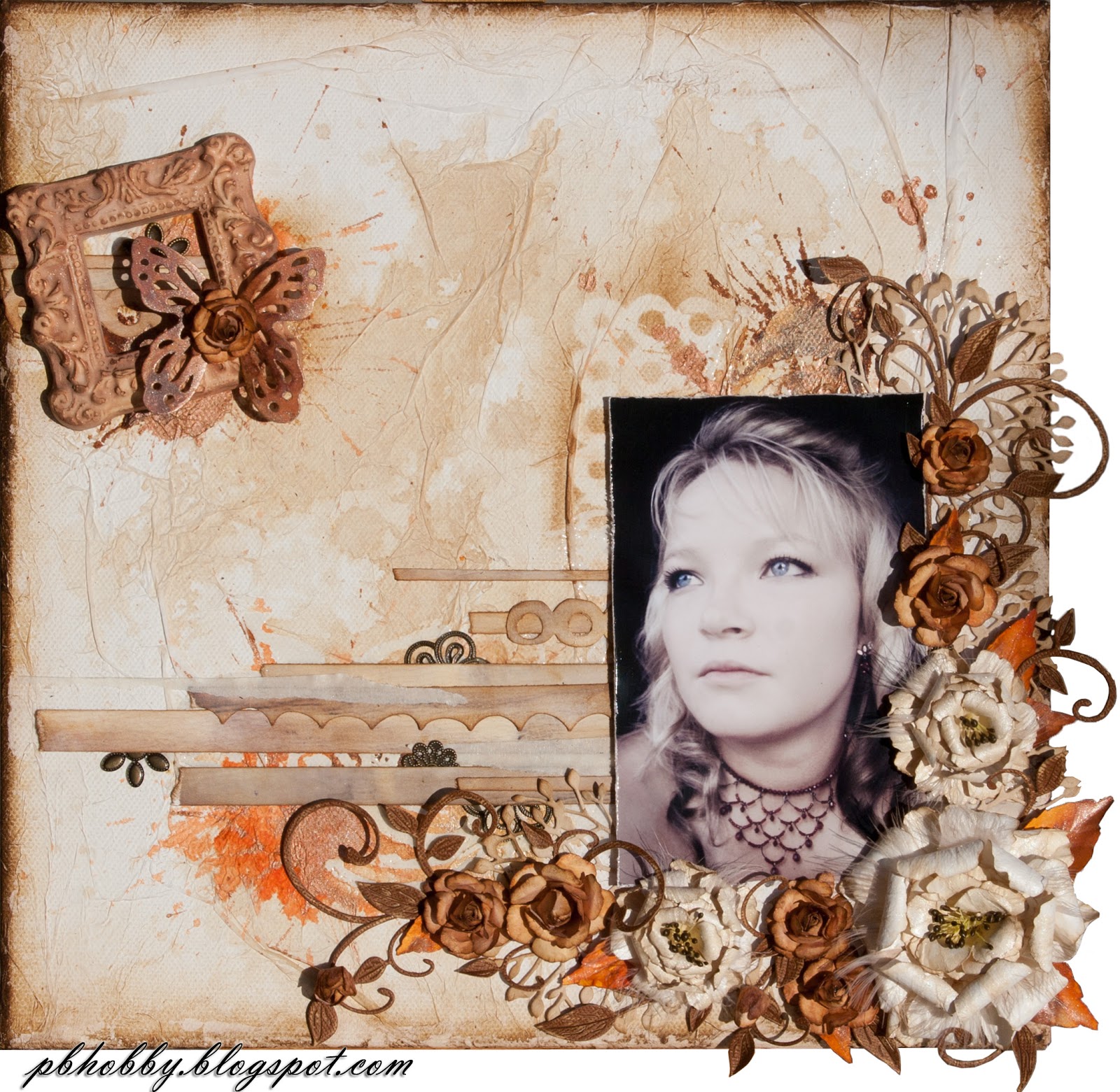Les embellissements et le titre ont été travaillés de la même manière : une couche de Gesso, puis une couche d'encre Distress, de la UTEE et c'est terminé. Pour plus de détail, rendez vous sur le site de Scrap à la loupe.